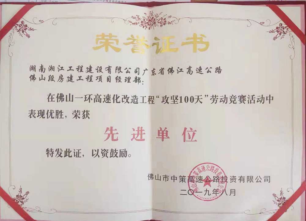 近期,由公司承建的佛山高速公路佛山段房建工程項目部在佛山一環(huán)高速化改造工程開展的“攻堅100天”勞動競賽活動中表現優(yōu)異,以高質量的工作成績力超中國鐵建等三家參建企業(yè),榮獲業(yè)主單位頒發(fā)的先進單位榮譽稱號。